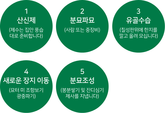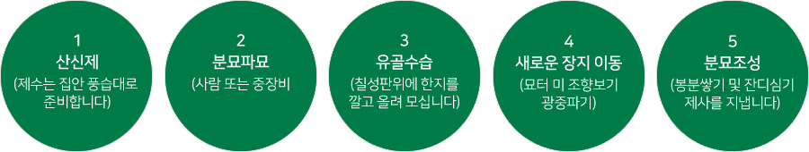 개장을 하여 유골을 수습하고 매장 절차를 순서대로 거쳐 새로운 매장지로 옮기는 것을 말합니다.